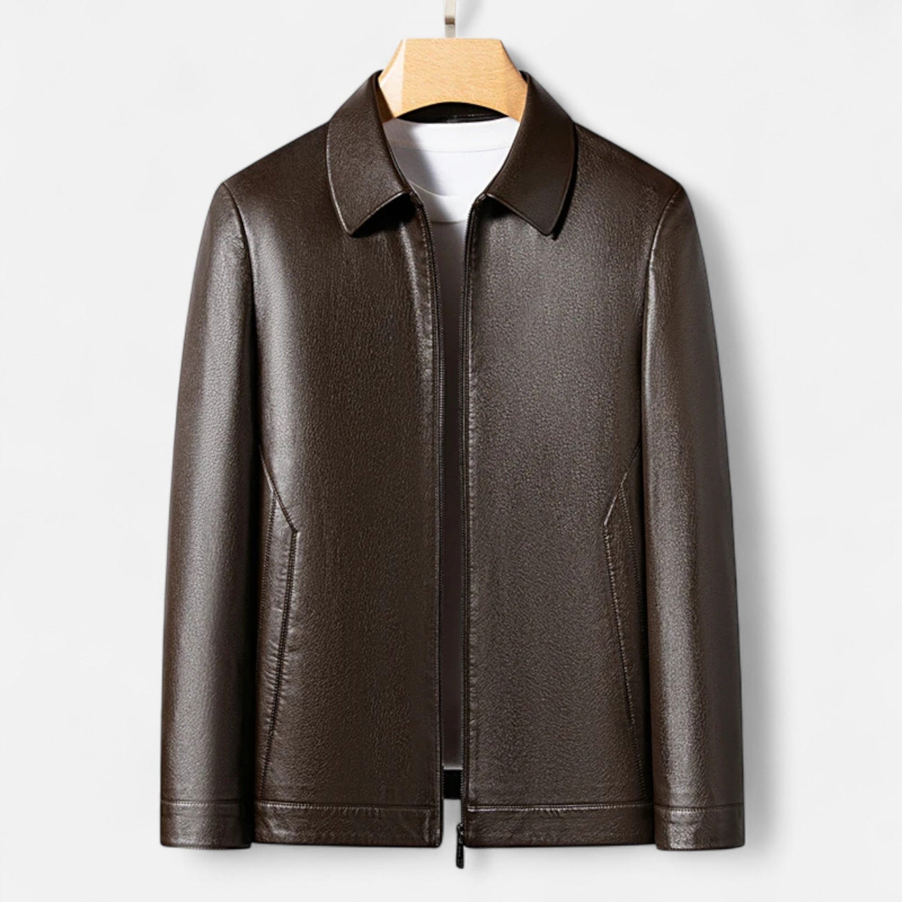 Díky hladkému koženému povrchu a střiženému střihu bunda vyvažuje moderní casual a business-ready svrchní oděv. Perfektní na podzimní dny a chladné večery, snadno se vrství přes košile nebo jemné pleteniny a nabízí elegantní, sebevědomý vzhled.