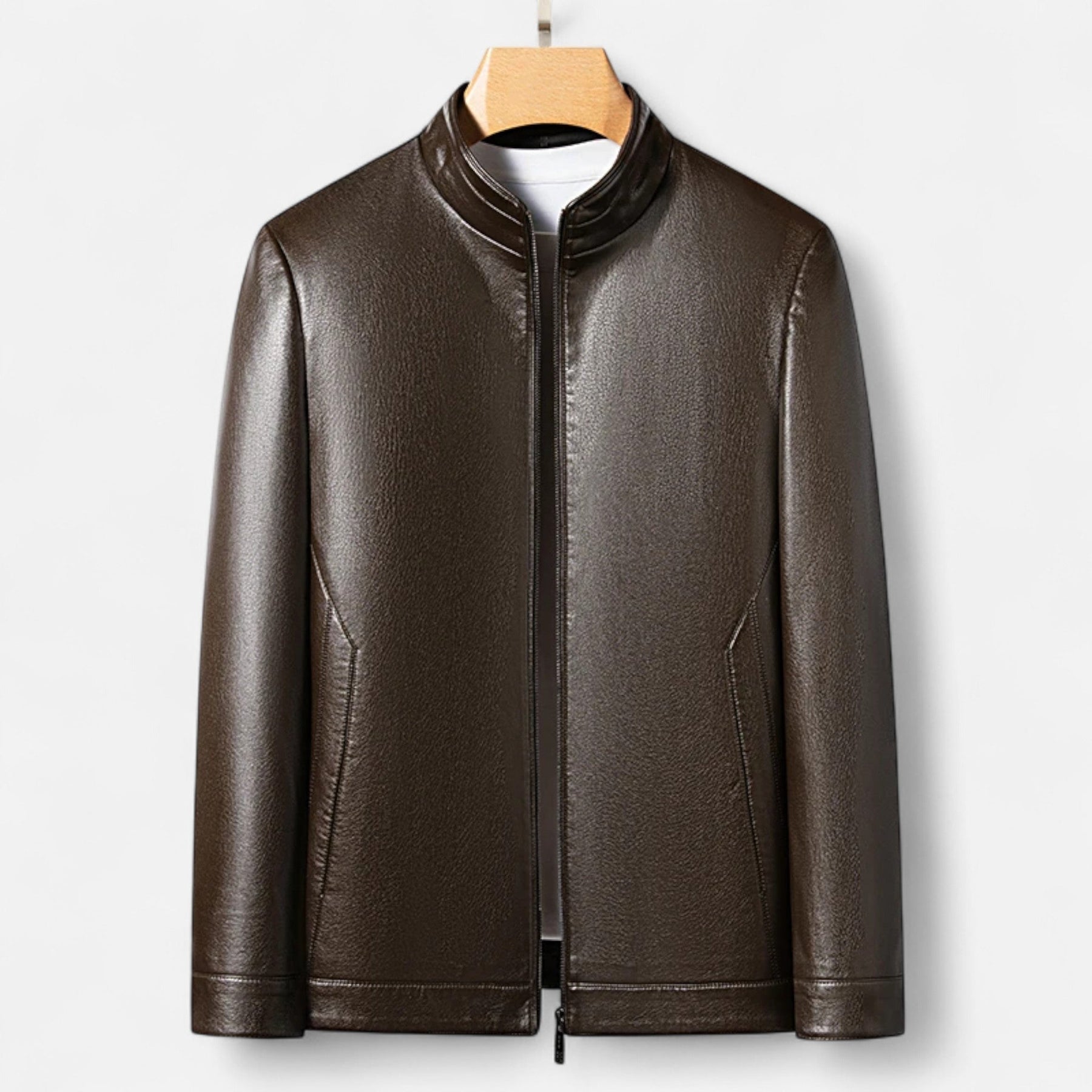 Představujeme originální bundu z PU kůže navrženou pro gentlemana, který si cení nenápadné síly a nadčasového stylu. S konstrukcí se stojáčkem a elegantním střihem inspirovaným polokošilí je tento kousek vytvořen pro rafinovanost a zároveň sezónní všestrannost.